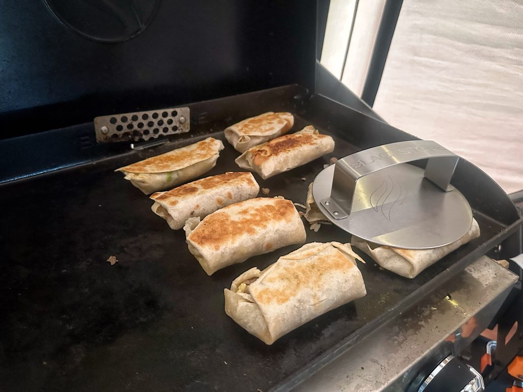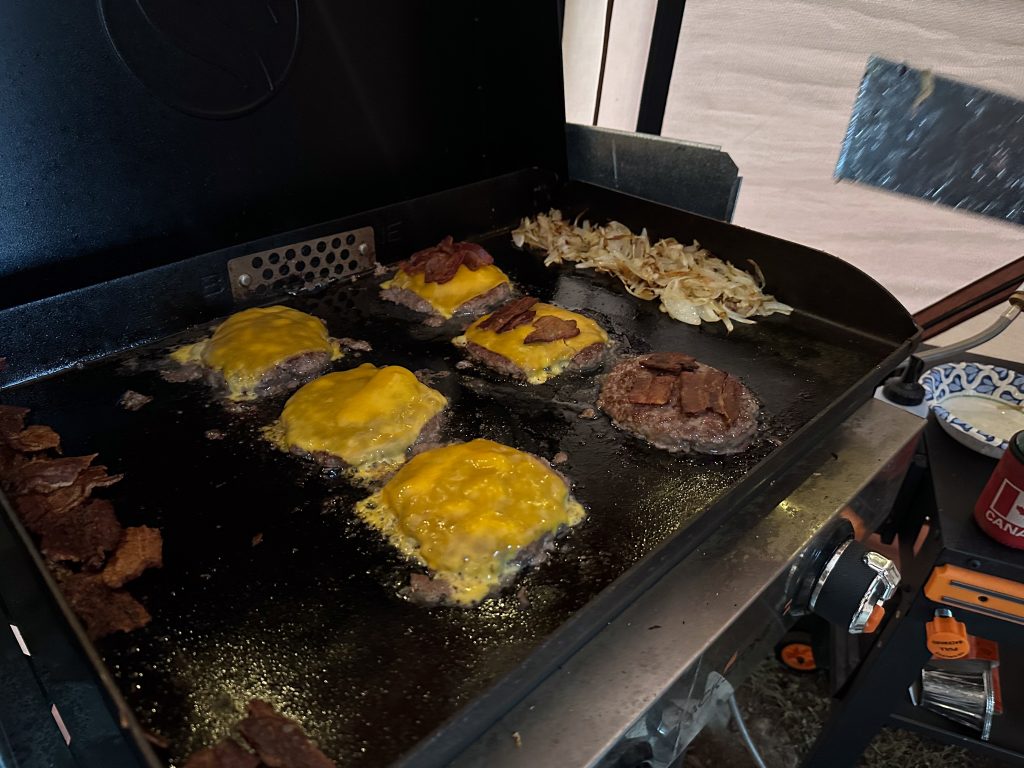Always a crowd favorite! Crispy edges, melted cheese, butter-toasted buns, and caramelized onions—all cooked on the Blackstone while your buddy burns a hot dog beyond recognition over the fire. The secret? Smash that patty like it owes you money. Add cheese, onions, and watch other campers gather like you just rang the dinner bell!