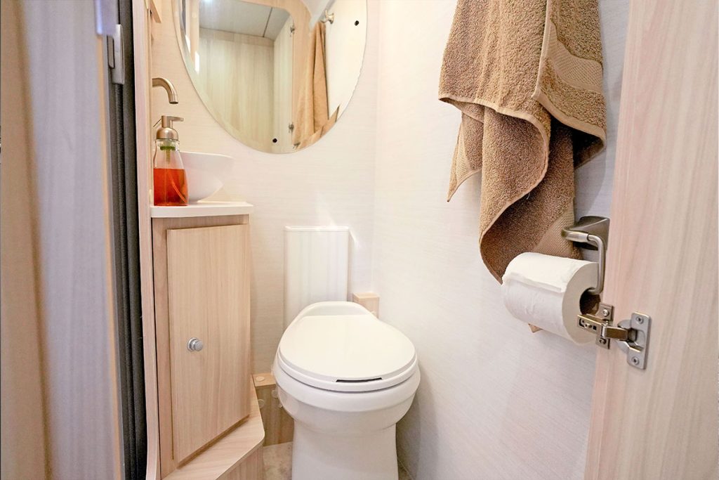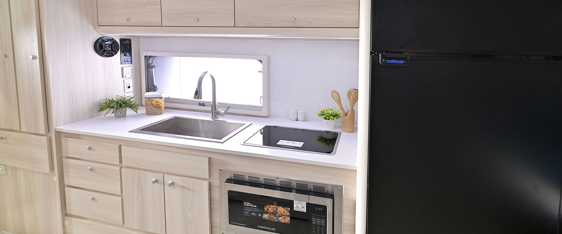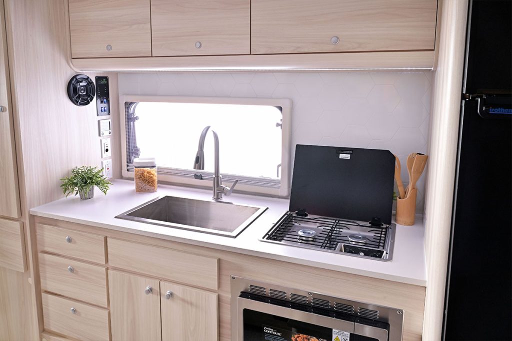 Experience the comforts of home on the road with a fully equipped kitchen – including a three-burner stove top, oven, microwave, and refrigerator. A plush queen-sized bed ensures restful nights, while the open living area provides ample space to unwind and enjoy your time.