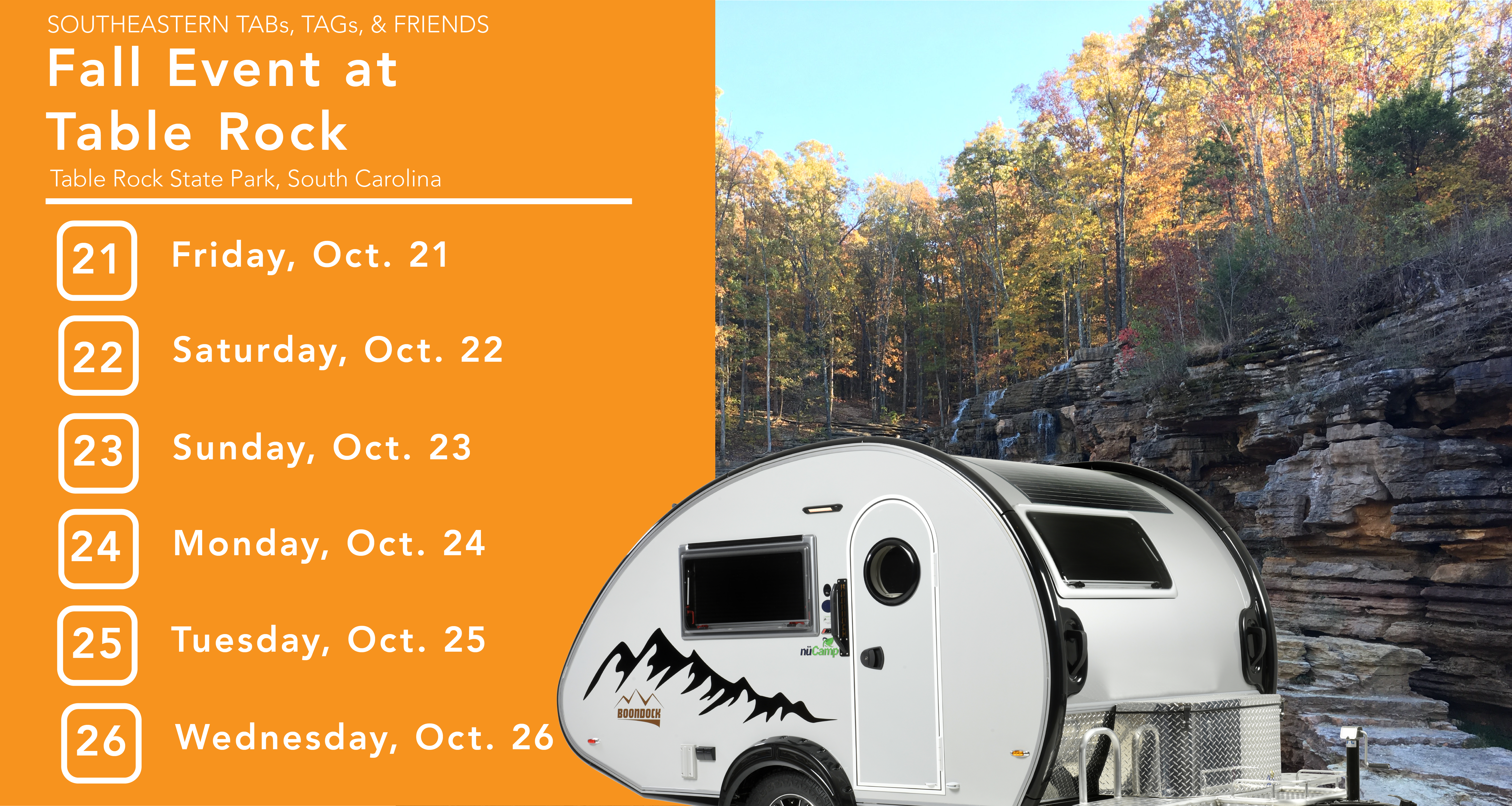 This nuCamp owners gathering is one of many rallies hosted by the Southeastern TABs, TAGs, & Friends Facebook group throughout the year. The Fall Event at the Table Rock is held at Table Rock State Park in Pickens, South Carolina. Activities include hiking and mingling with friends. For more information, join the Facebook group or contact host … Continued