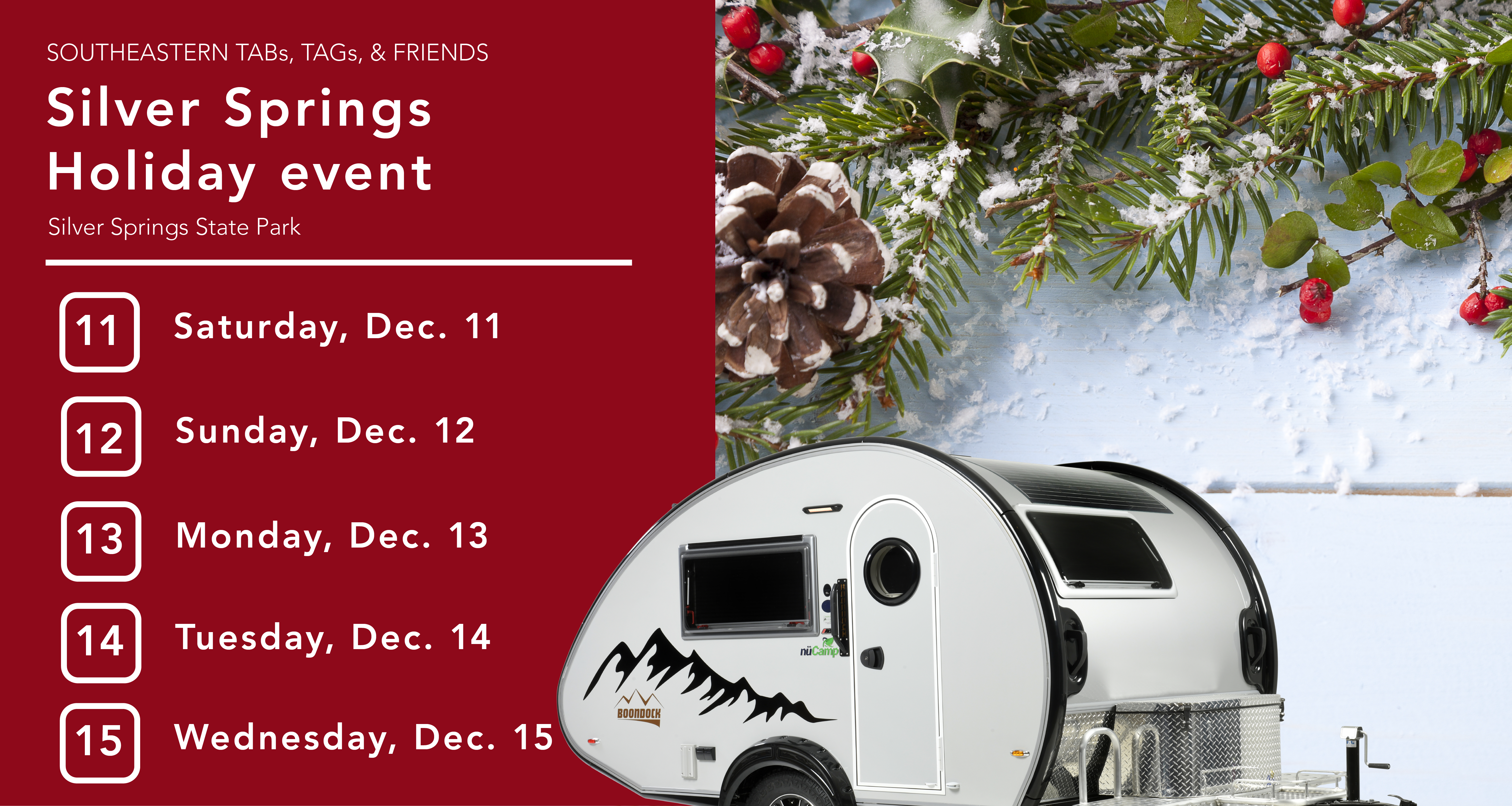 This nuCamp owners gathering is one of many rallies hosted by the Southeastern TABs, TAGs, & Friends Facebook group throughout the year. The Silver Springs Holiday Event is your chance to get together with nuCamp friends and family to celebrate the holiday season! This event takes place in Ocala, Florida at Silver Springs State Park. … Continued