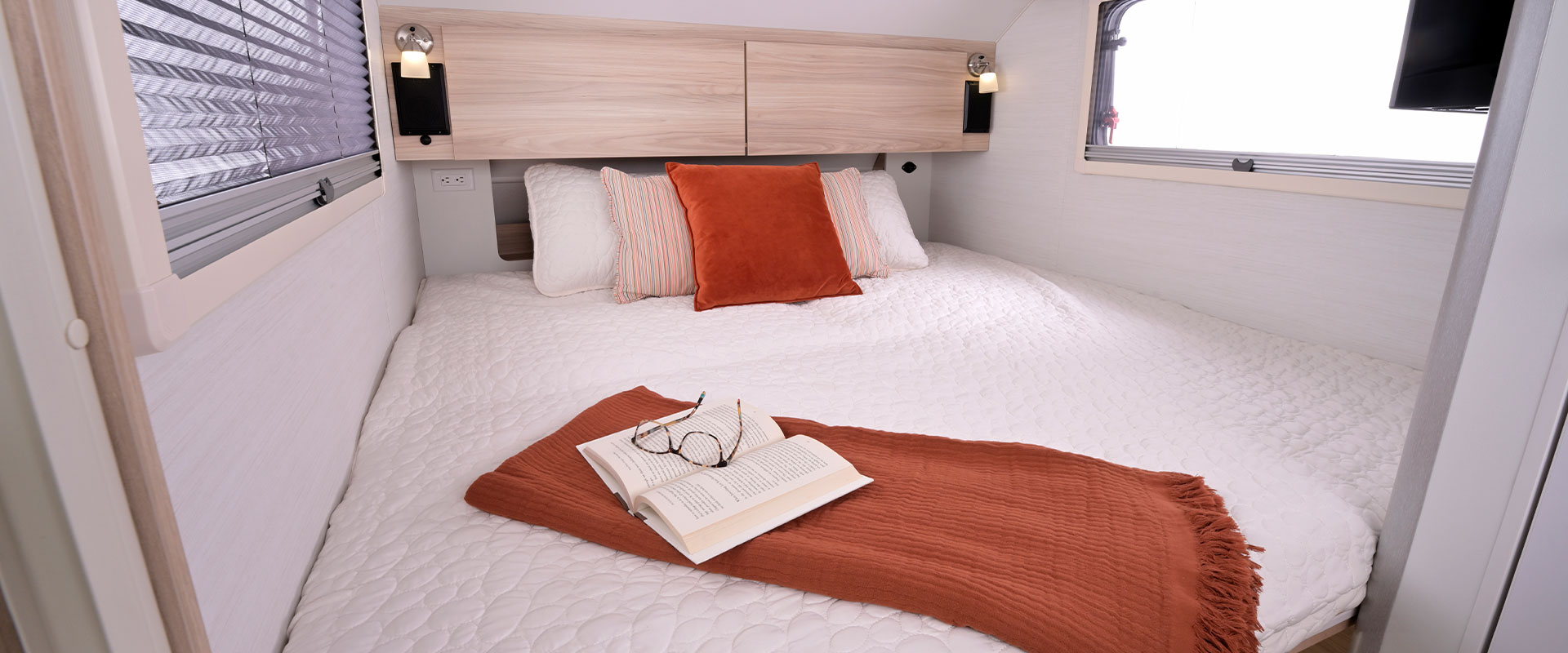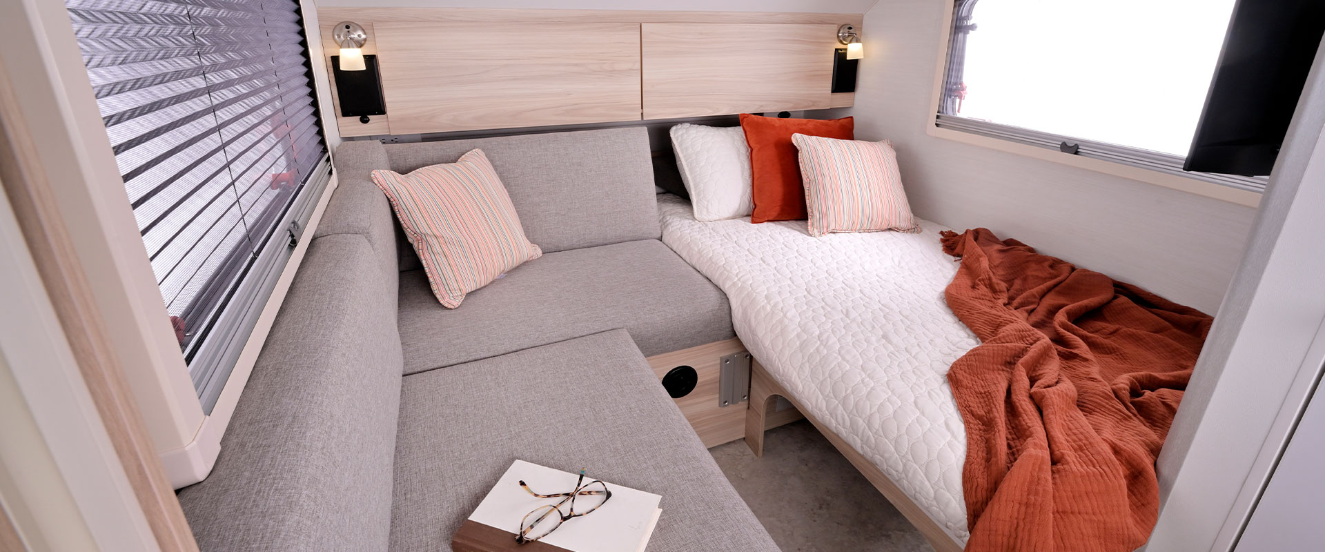 Inside, the TAB 320 offers a comfortable living space equipped with a full-featured kitchenette, a cozy sleeping area, ample storage, and even a bathroom, everything you need for a convenient and enjoyable camping experience.